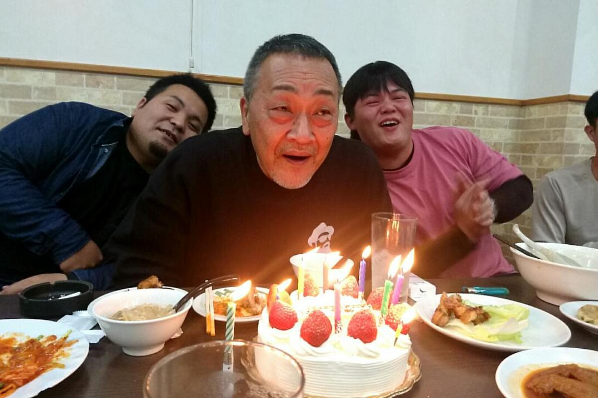 ひととおり、食べた所でバースデーケーキ・・・からの腕相撲大会